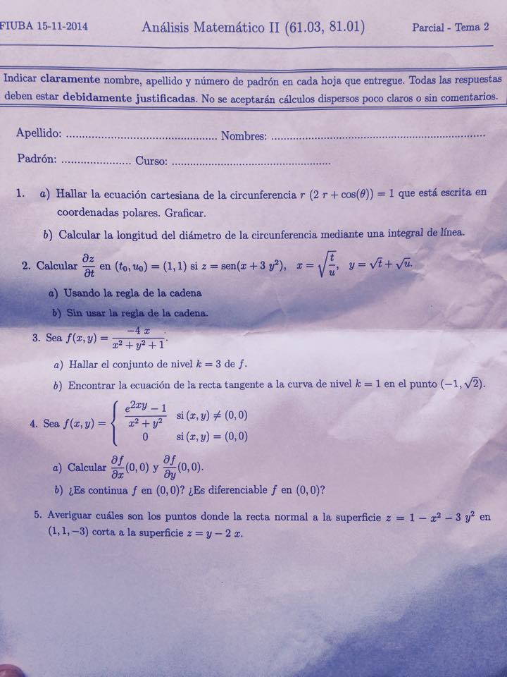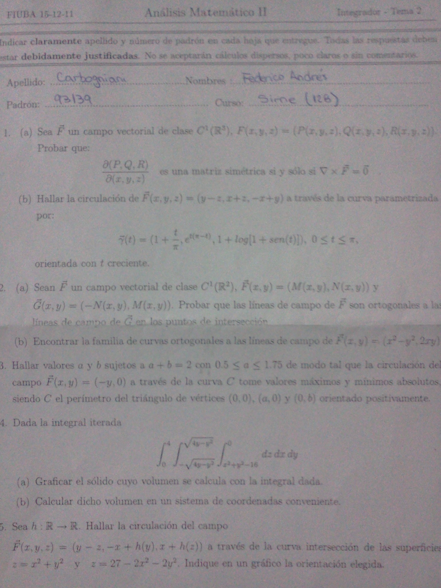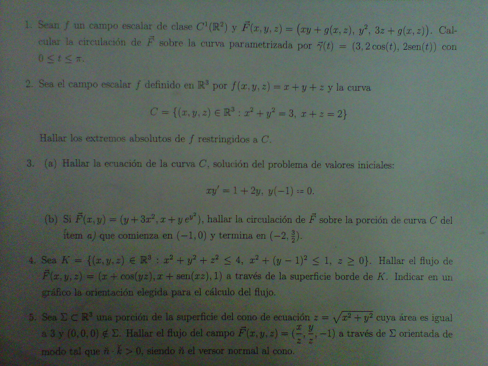 Integrales de línea: Definición de integral de línea de campos escalares y vectoriales. Propiedades. Invariancia por cambio de parámetro. Trabajo. Campos de gradientes. Propiedades. Función potencial. Su determinación. Condición necesaria y suficiente para la existencia de una función potencial. Ecuación diferencial total exacta. Teorema de Green. Su extensión a recintos múltiplemente conexos.