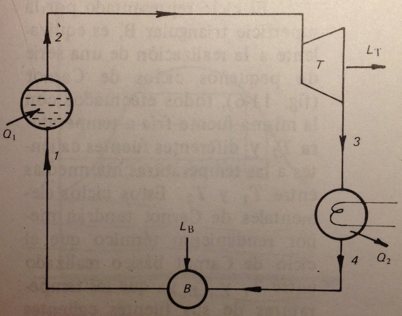 En un ciclo de vapor, el líquido saturado a la salida del condensador, entra a una bomba adiabática de rendimiento isoentrópico = 1 y es comprimido hasta la presión de la caldera. Representar en un esquema del diagrama T-S la evolución y determinar analíticamente el trabajo de la bomba y la entalpía del líquido a la salida de la misma.